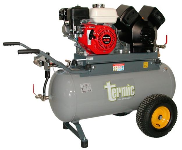 Compresseur mobile thermique TERMIC 26/100 - 26 m3/h - Groupe bicylindre en V fonte turbo ventilé - 100 Litres - 11 bars - Moteur 4,8 CV (HONDA Essence GX 160 démarrage manuel) - 2 sorties raccords rapides : 1 directe et 1 filtrée/régulée