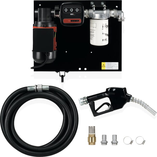 Pompe à palettes avec by-pass intégré 60 l/min 230 V. Moteur IP66 avec pistolet automatique avec raccord tournant. Flexible de refoulement de 8 m. Compteur mécanique NUMERIxx 3 chiffres. Filtre gazole interchangeable 30 um. Clapet antiretour avec filtre.